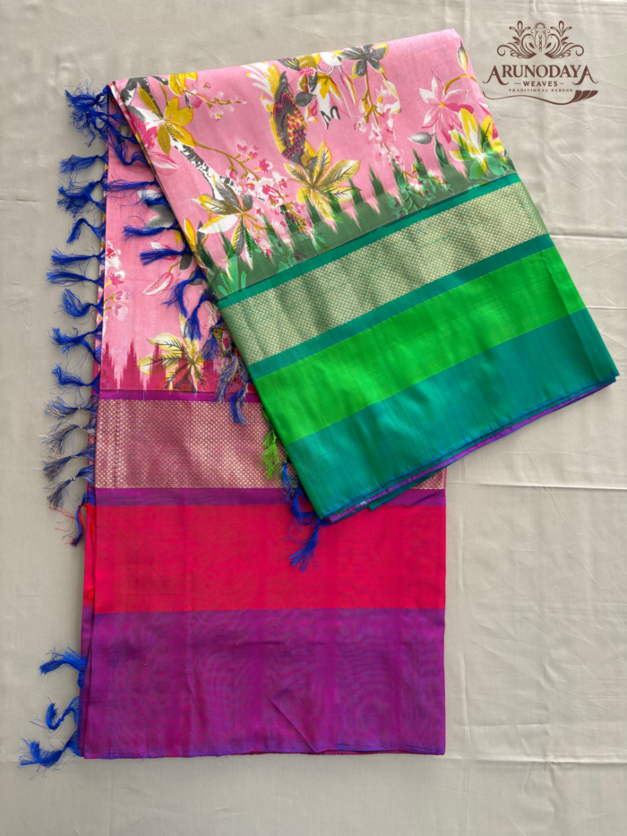 Ikkat Floral print Kanchipuram Boader Silk Saree