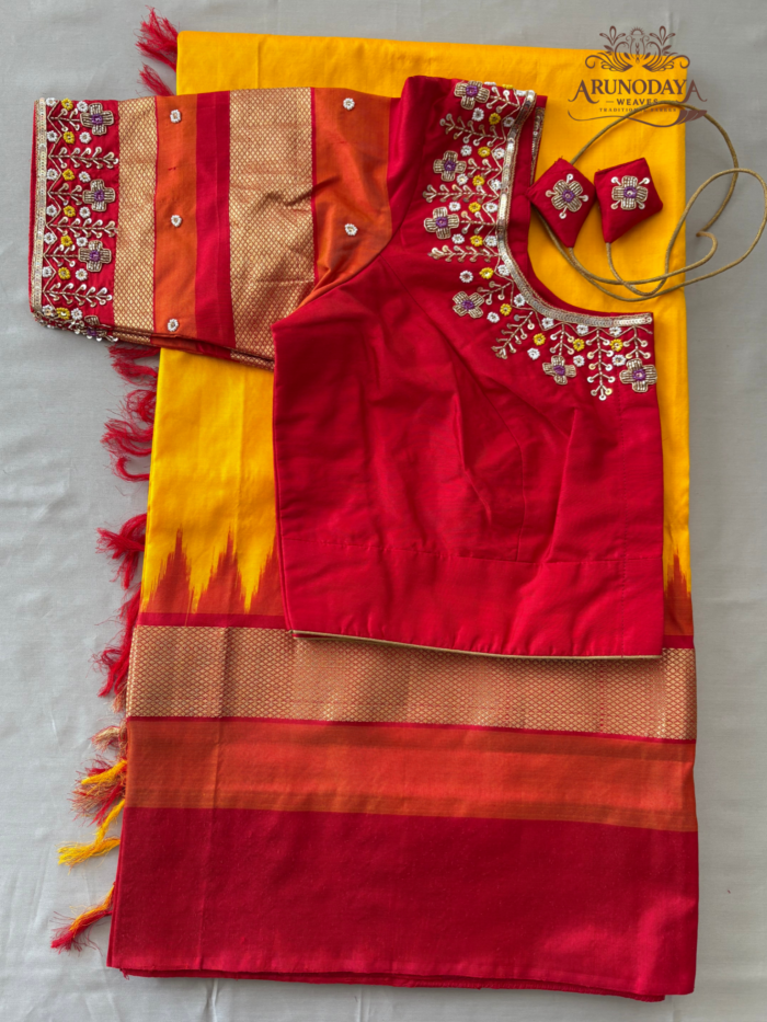 – The saree is crafted using double weaving techniques, which not only enhance its durability but also give it a richer texture and a more pronounced pattern.