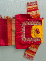 – The borders and pallu are adorned with opulent tissue ZARI work, adding a touch of regal splendor. The intricate ZARI patterns enhance the saree’s overall appeal, making it perfect for grand occasions.